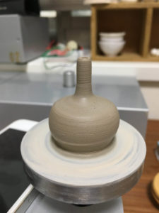 ドライヤーを当てながら、ろくろを引く